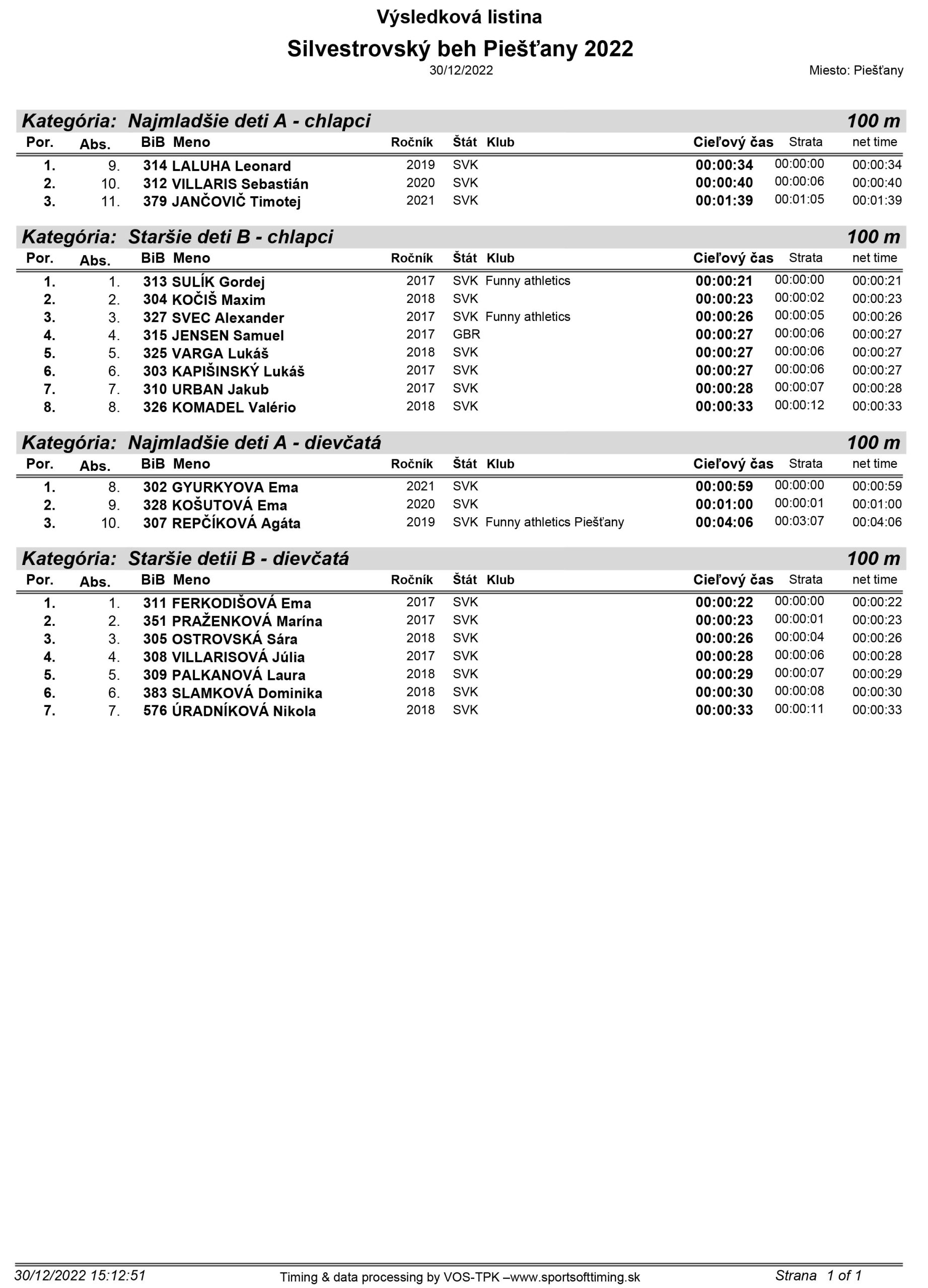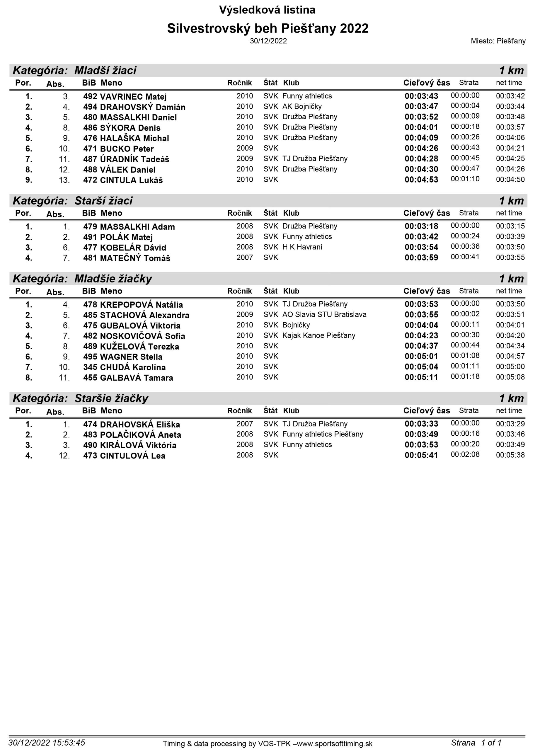Silvestrovský beh prilákal takmer 500 pretekárov, takže účasť po pandemických obmedzeniach dosiahla mimoriadne čísla. Premiérový rekord certifikovanej trate stanovil Ondrej Kubo v čase 32 minút 31 sekúnd. Úspešná bola aj zbierka pre malú bojovníčku Timku, ktorej na potreby liečenia a rehabilitácie putuje 1300 eur.