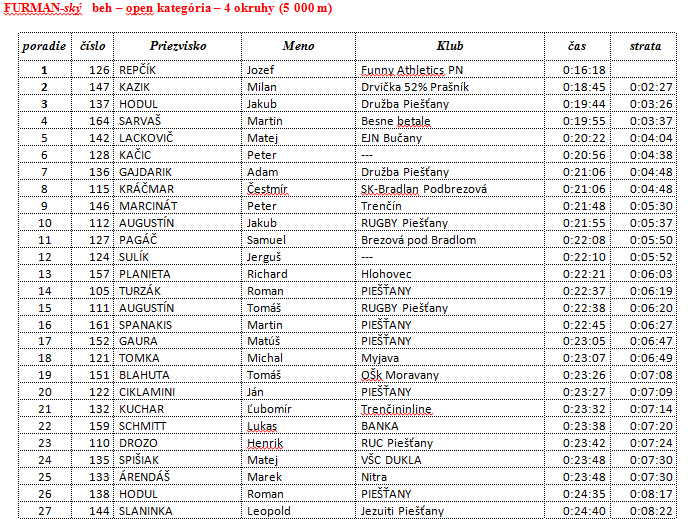 Najrýchlejším pretekárom vo furmanskom behu sa stal Jozef Repčík, päť kilometrovú trať zdolal v čase 00:16:18. Premiérovú štafetu vyhral tím Dubnickí futbalisti v zložení Ivan Pavlík a Štefan Štefina, dva 2 500 metrov dlhé úseky pokorili za 17 minút 2 sekundy. Pretekov sa zúčastnil aj Matej Spišiak, reprezentačný tréner Mateja Tótha, ale aj členovia Rugby Union Clubu Piešťany, ktorí trať absolvovali so šišatou loptou i partia recestistov v oblekoch s vkusnými motýlikmi. Kompletné výsledky nájdete pod foto-galériou.