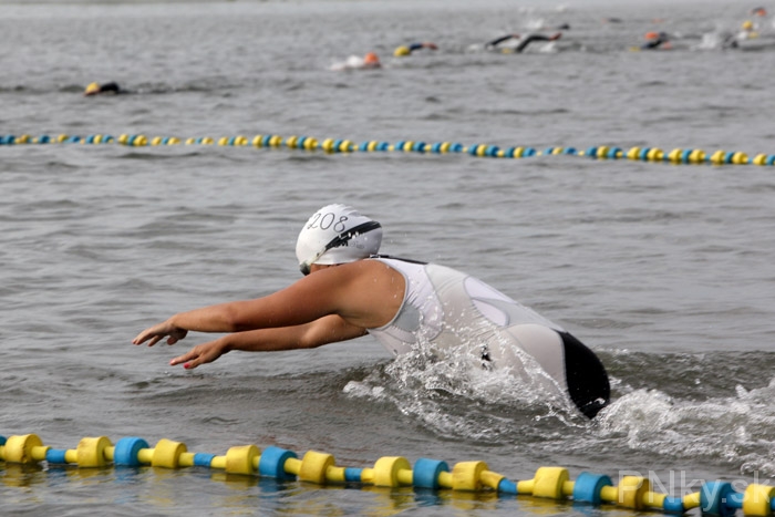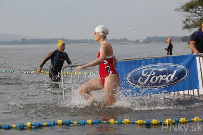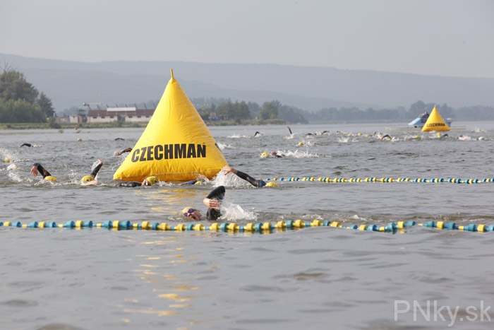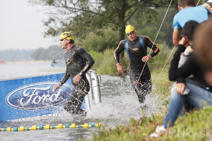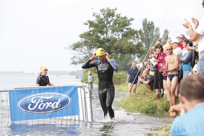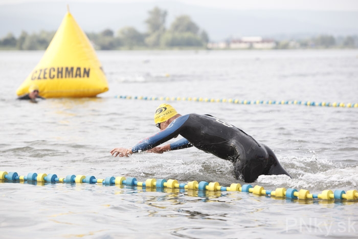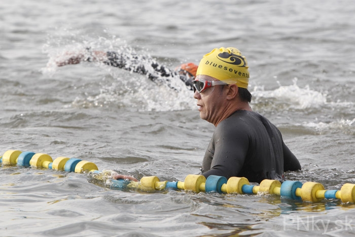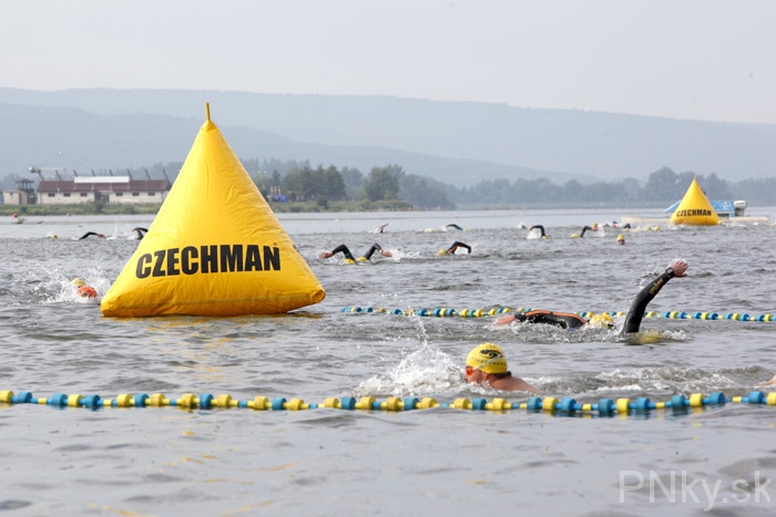 Skoro štyri kilometre plávania najlepšie zvládol Andrej Orlický z Triatlon Teamu Trnava v čase 45:32. Na druhom mieste vybiehal z vôd Váhu Pavel Šimko z Ekol Elite Triatlon Teamu, ktorý strácal jeden a pol minúty. Tretí bol po plaveckej časti minuloročný víťaz Petr Vabroušek, tesne prenasledovaný štvrtým Karolom Džalajom.