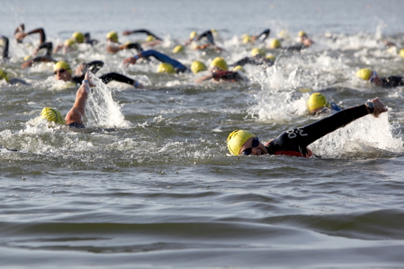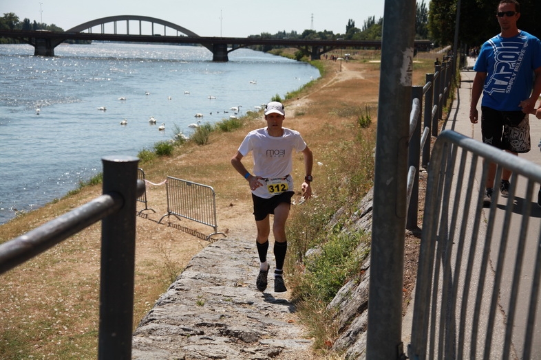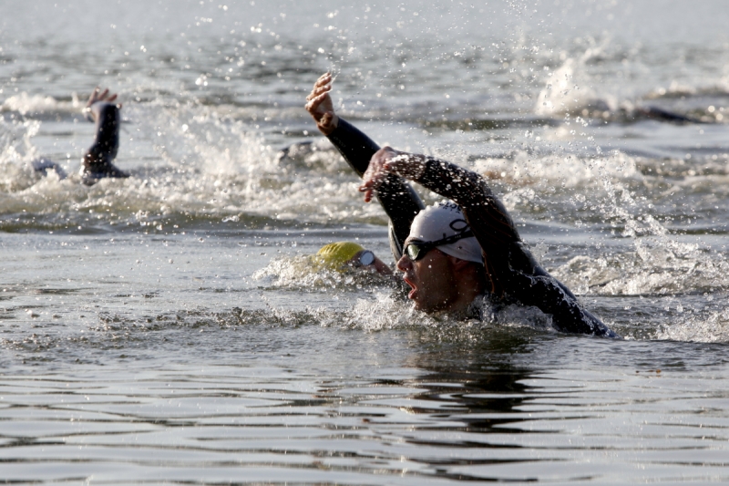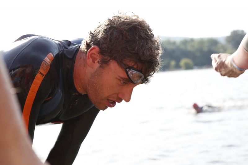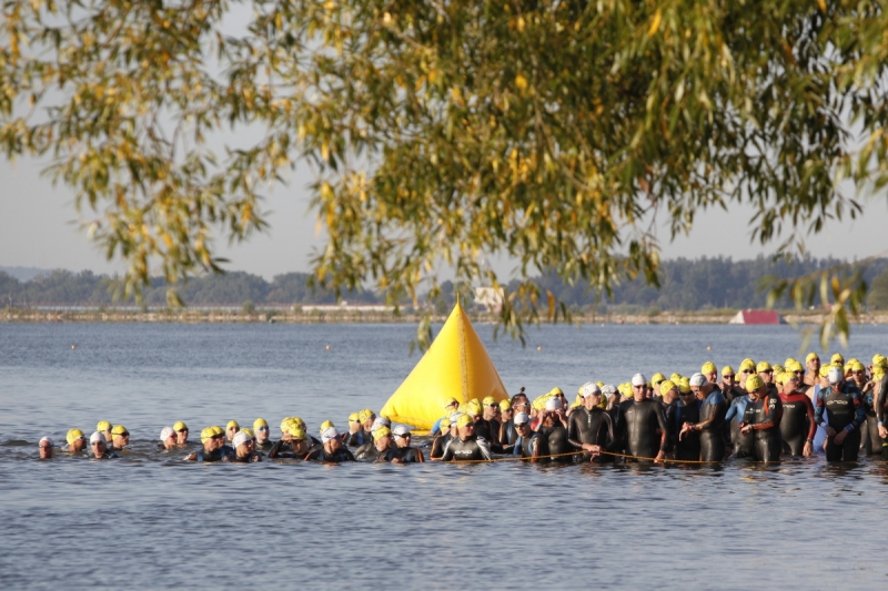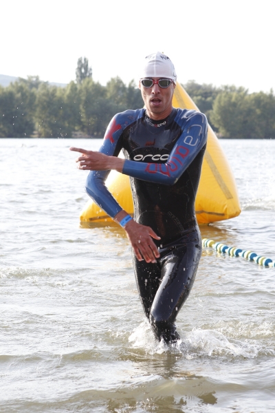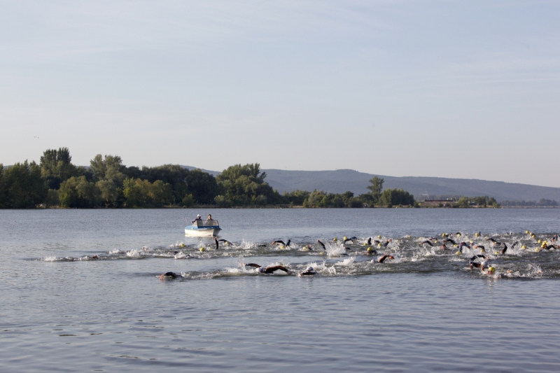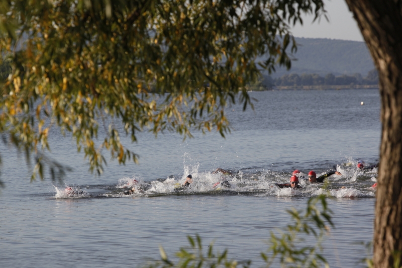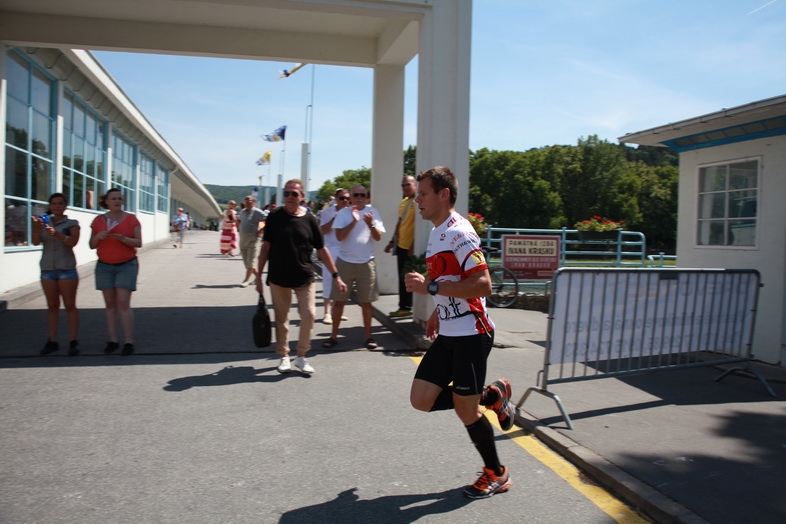 Pretekári sa vydali už o siedmej ráno na takmer štyri kilometre plávania vo vodách Váhu. Najrýchlejším plavcom bol už tradične Andrej Orlický z Trnavy, ktorý 3,8 km zvládol za 47:38 min. Druhý šiel z vody Lukáš Slatinský so stratou vyše päť minút. Na treťom mieste doplával Lukáš Krpec. Top favorit Petr Vabroušek bol po plaveckej časti až na deviatom mieste so stratou približne 7,5 minúty.