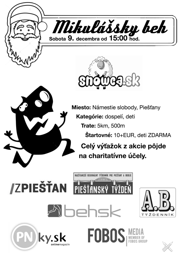 V sobotu 9. decembra sa uskutoční na Námestí slobody v Piešťanoch nultý ročník Charitatívneho Mikulášskeho behu. Pozvaní sú všetci. Dospelí aj deti. Ak prídete oblečení ako ako Mikuláš či Santa Klaus, bude mať podujatie naozajstný punc mikulášskeho behu.