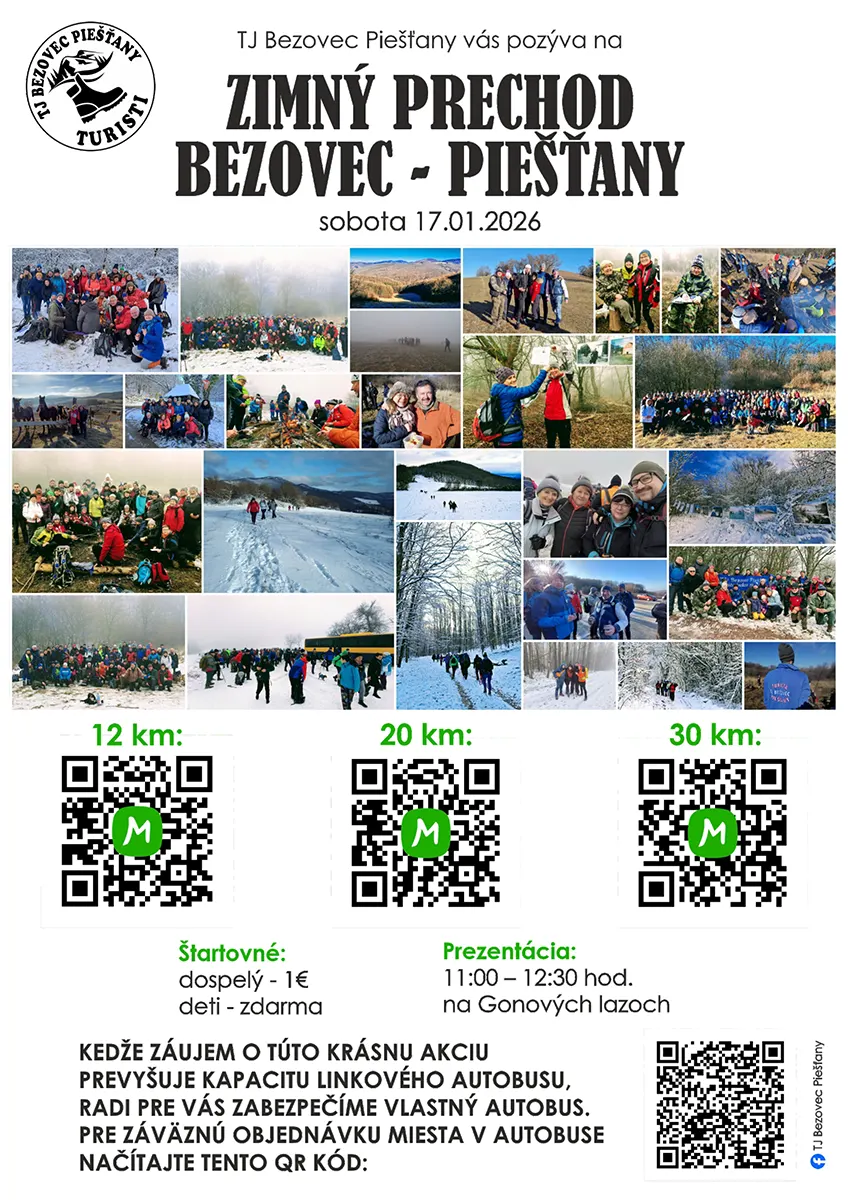 Obľúbené turistické podujatie Zimný prechod Bezovec – Piešťany sa uskutoční v sobotu 17. januára už po štyridsiaty raz. Ostatné roky boli na snehovú pokrývku zväčša skúpe, o to výnimočnejší je jubilejný ročník, keď sa podľa všetkého bude dať na bežkách dostať minimálne z Bezovca na Gonove lazy.
