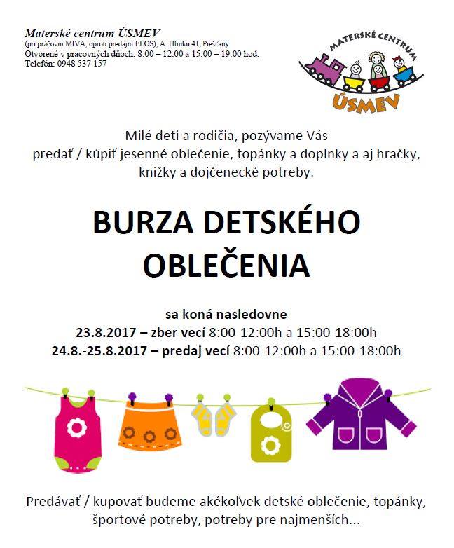 Reklama V Materskom centre Úsmev sa tento týždeň uskutoční burza detského oblečenia. Zber vecí, ktoré chcete predať je naplánovaný na stredu 23. augusta, predaj na štvrtok a...